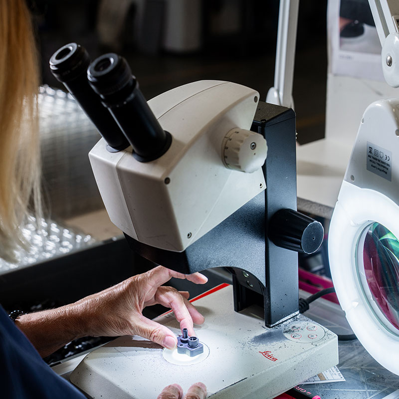 - Controllo al 100% dei pezzi prodotti tramite microscopi e strumenti di misura dedicati.